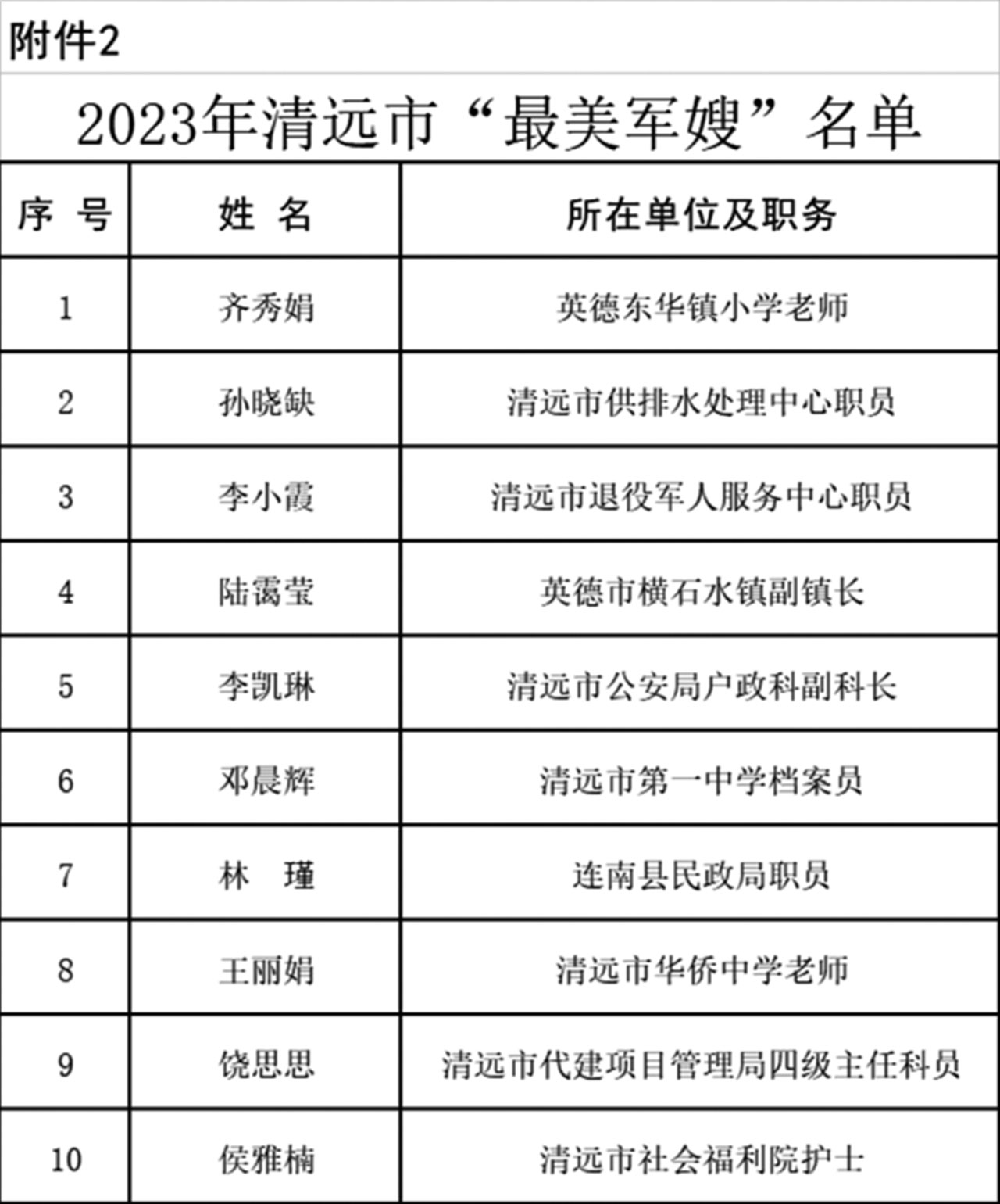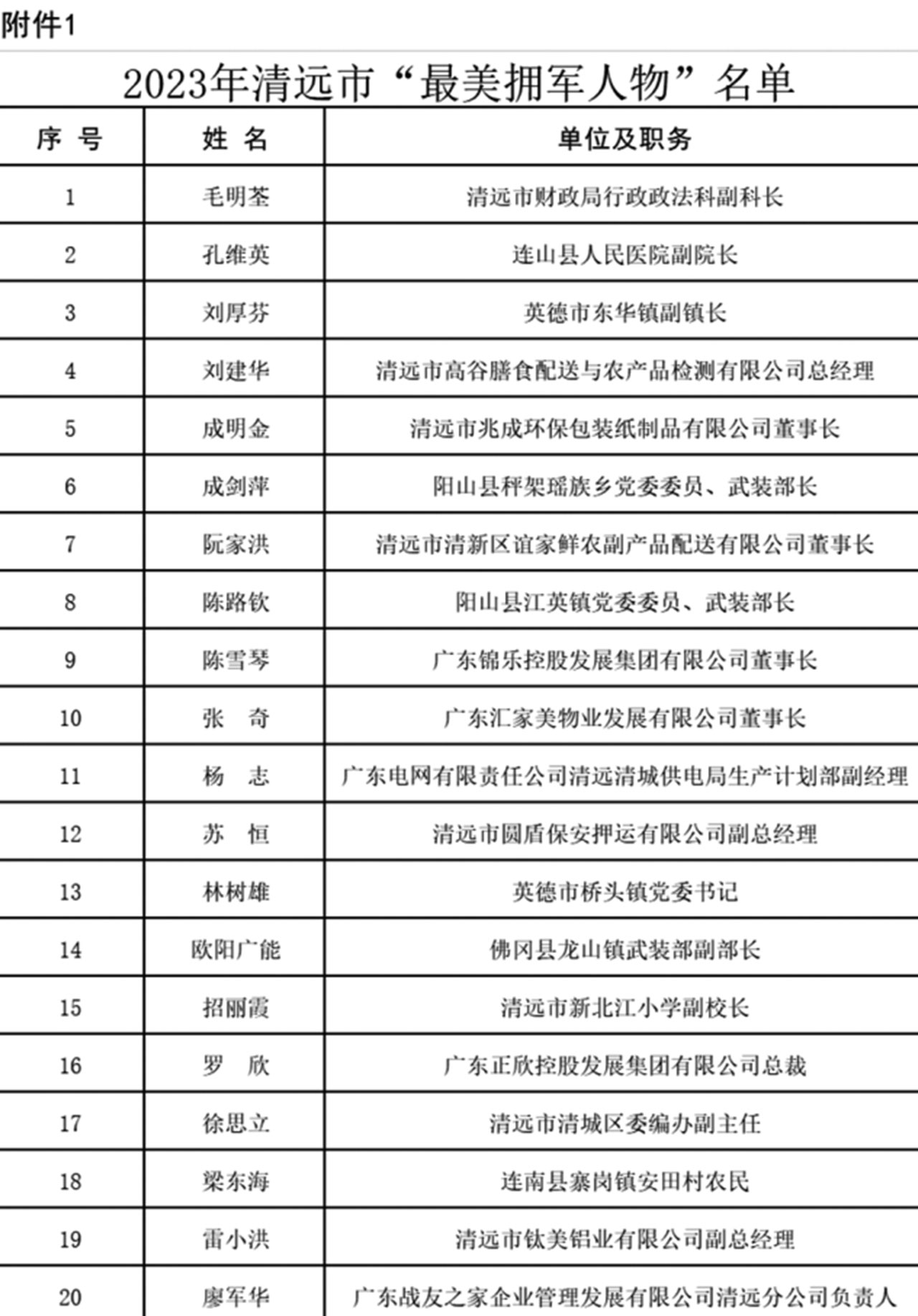 为激励广大干部群众学习最美、争当最美,在全社会大力营造关心国防、尊崇军人浓厚氛围,营造立足岗位作贡献、建功立业新时代的时代风尚,清远市双拥工作领导小组对毛明荃等20名“最美拥军人物”、齐秀娟等10名“最美军嫂”予以通报表扬。