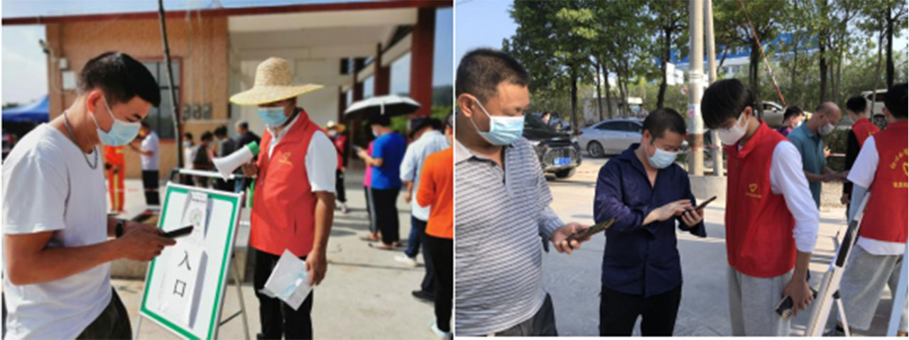 个志愿小组前往源潭新马区域核酸检测点,全力支持配合核酸检测工作,积极做好现场引导分流、检查村民场所码、行程卡、维持检测秩序、核酸码扫码记录、为老人登记信息生成核酸码、派发棉签,并引导完成核酸检测的村民有序、安全离场。